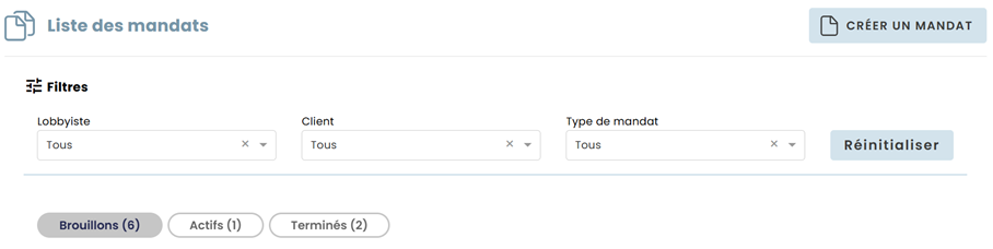 - Sélectionner le mandat pour lequel un changement est survenu en fonction de son état (brouillon, actif, terminé).